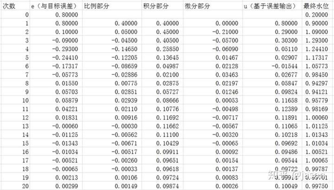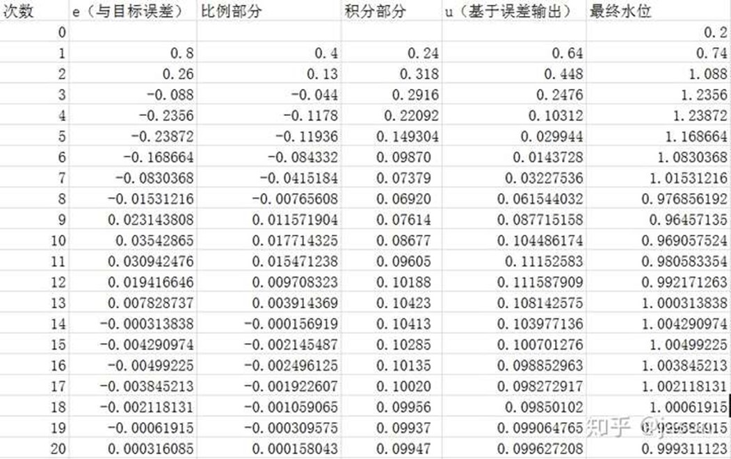 第一次: 误差为0.8, 比例部分 Kp*0.8=0.4, 积分部分 Ki*(e(1))= 0.24,加入水量u为0.4+0.24=0.64. 最终水位0.2+0.64-0.1= 0.74m