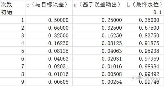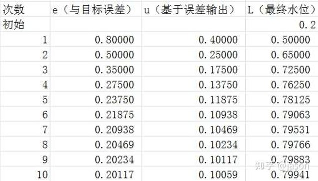 第一次,误差是 1-0.2=0.8m,那么加入水量是 Kp*0.8= 0.4mm.